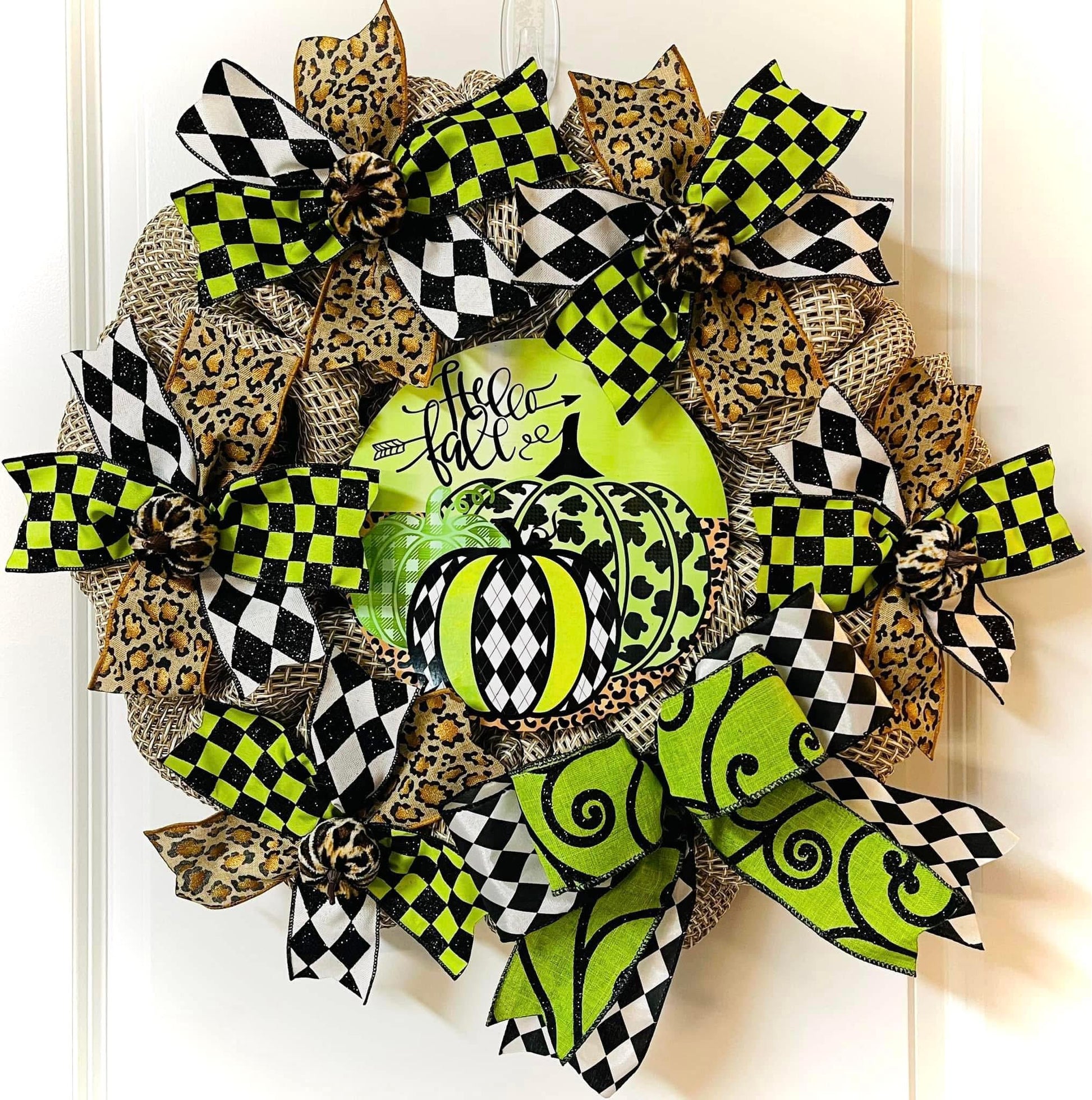This wreath is the regular 18 inch. Metal sign. Ribbon ends are heat treated to prevent fraying. Little velvet animal print pumpkins. Super fun for Fall or Halloween